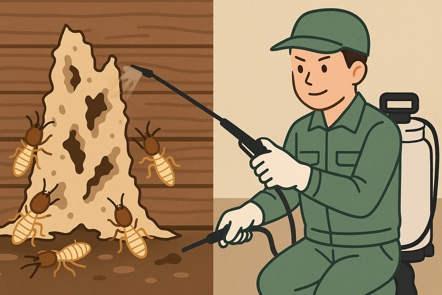 市販のスプレーで駆除を考える方も多いですが、実際には噴射距離や薬剤の種類、風向きの影響なども考慮する必要があり、素人では判断が難しい場面がほとんどです。