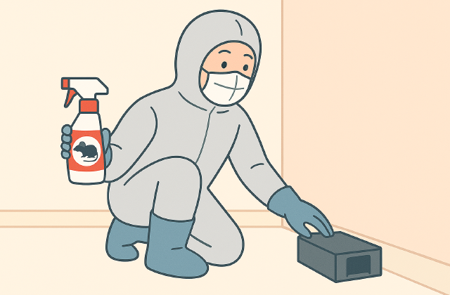 調査結果に基づき、トラップや粘着板の設置、侵入孔の封鎖、必要最小限の薬剤処理を実施。
