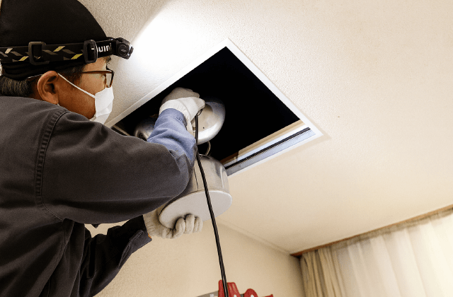 天井裏・壁内・配管まわり等を点検し、侵入経路・被害範囲・生息種を特定。