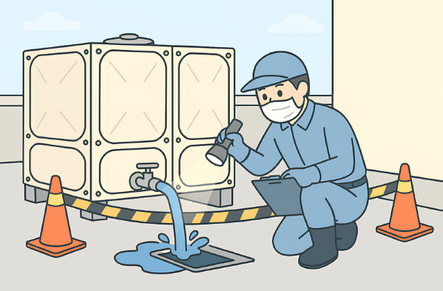 貯水槽の水を排水し、作業中の安全確保と衛生対策を徹底します。